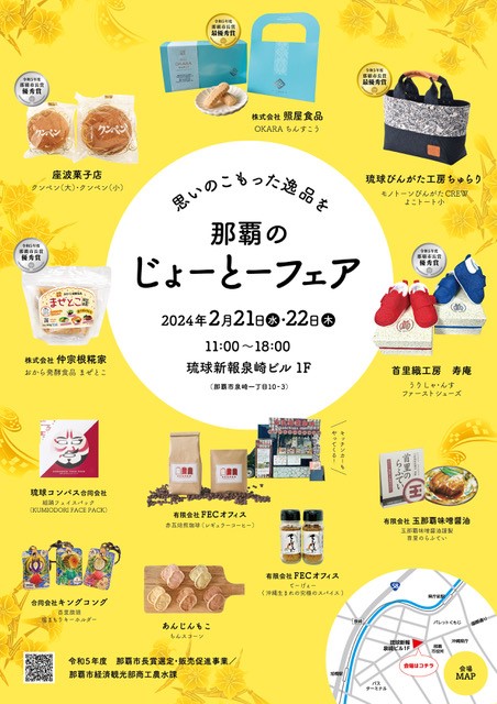 令和5年度那覇市長賞選定・販売促進事業を那覇商工会議所とのコンソーシアムで受託しました。 那覇市内の事業者が開発した優れた商品に贈られる那覇市長賞。 今回は20社24商品のエントリーがあり、その中から食品の部3商品、非食品の部2商品が受賞しました。 受賞した5商品に加え、最終候補に残った7商品をPRするイベント「那覇のじょーとーフェア」を令和6年2月21日~22日に琉球新報泉崎ビルにて開催。 2日間で700名以上の来場がありました。